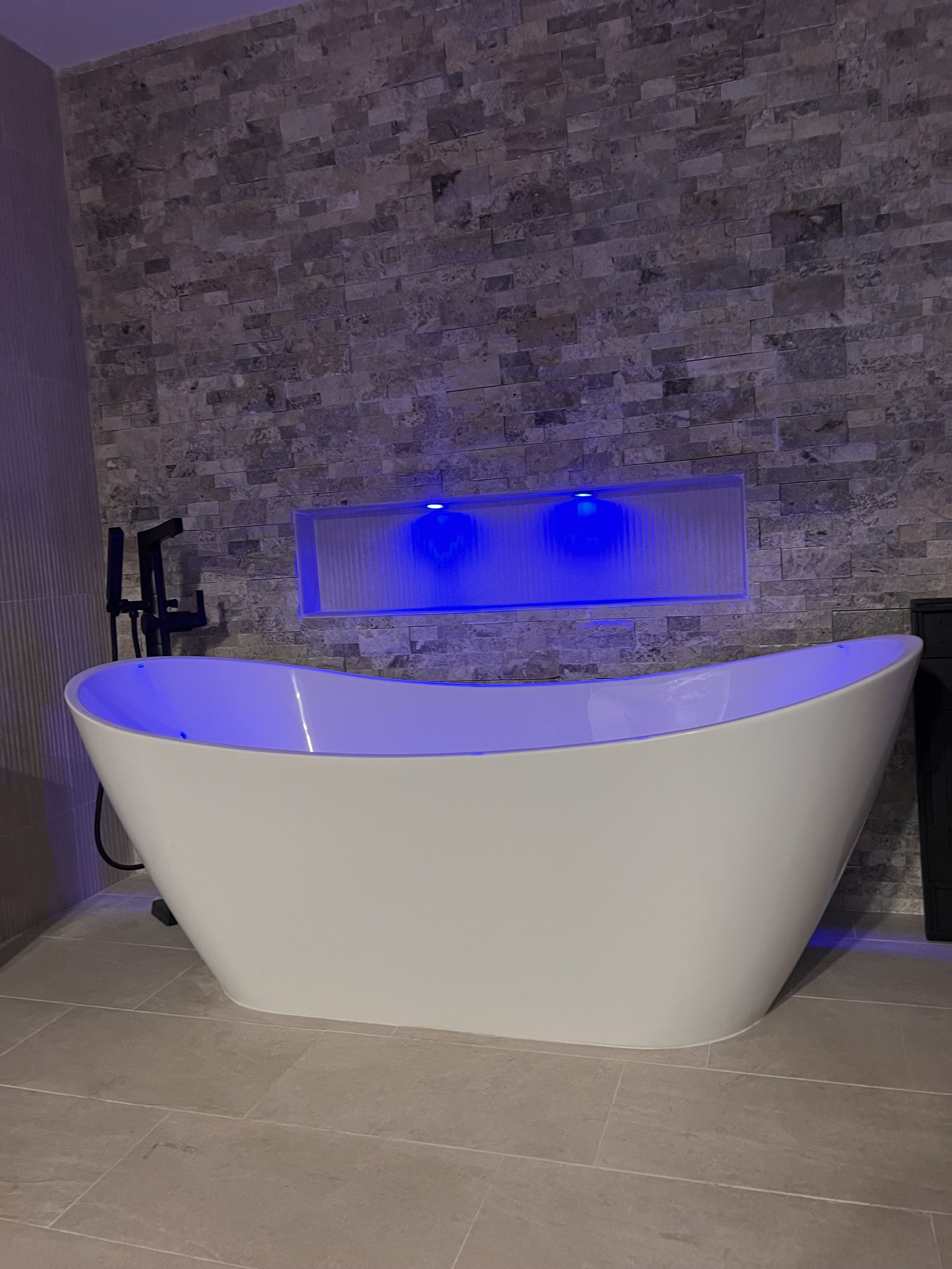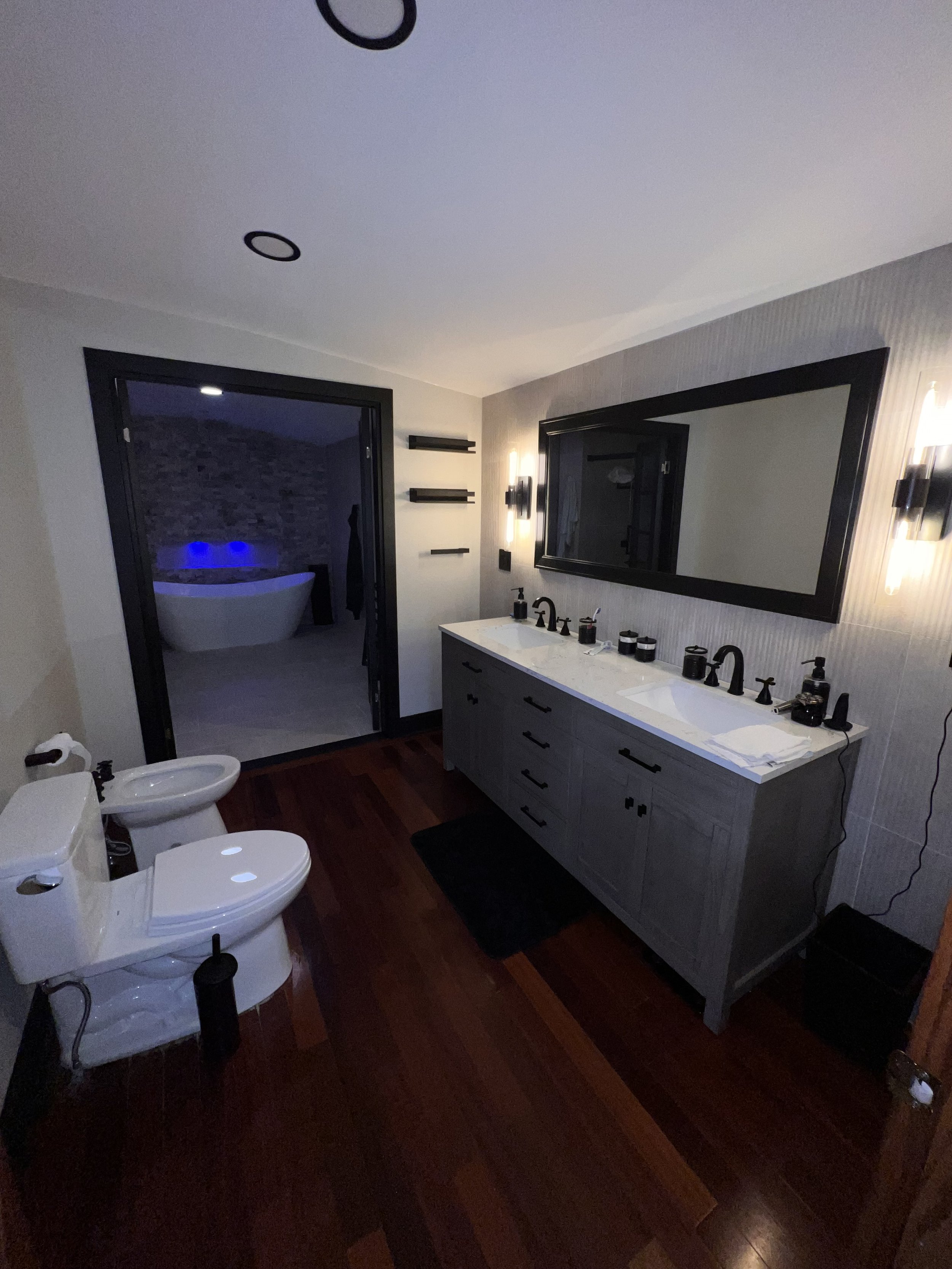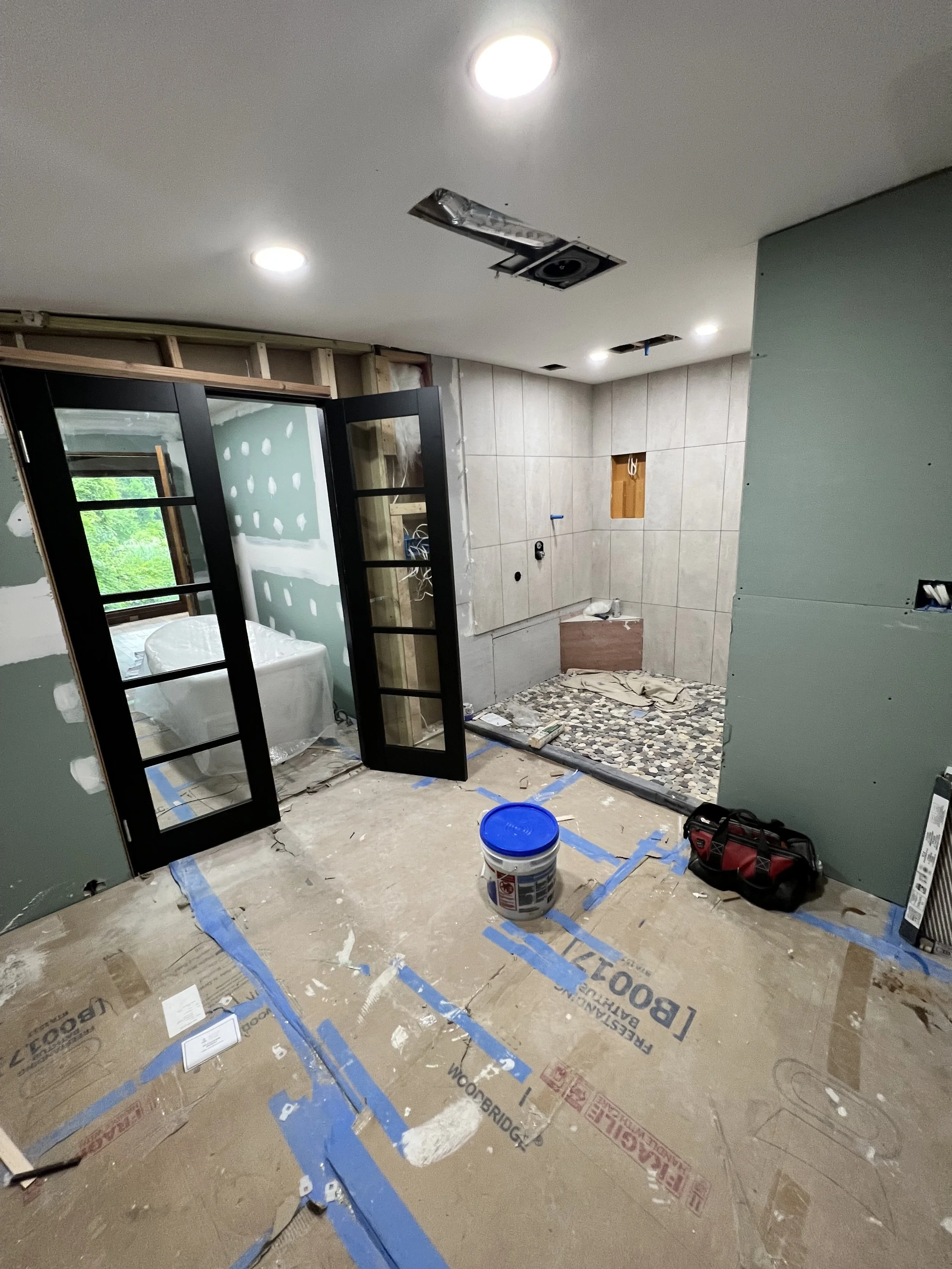 French doors entering a custom bathroom renovation including heated natural stone tiles, heated towel warmers, wall-to-wall tiles, two-person glass shower with stone fixings, towel and shampoo niches both in shower and soaking tub. Both including custom lighting.